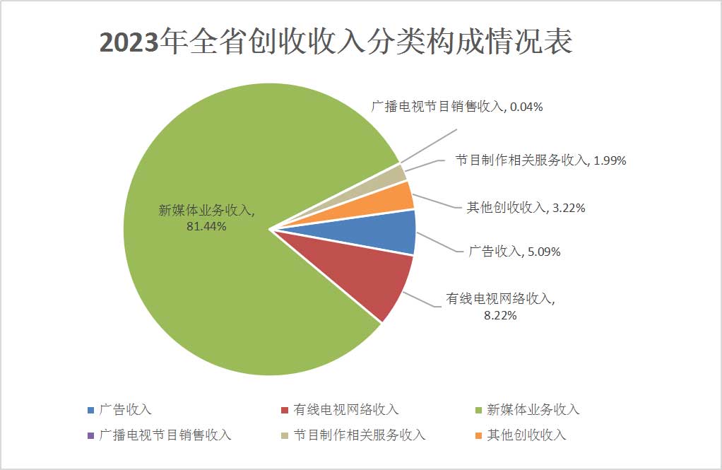 全省實(shí)際創(chuàng)收收入367.13億元,同比增長153.79%。其中,廣告收入18.67億元,同比增長11.61%;有線電視網(wǎng)絡(luò)收入30.17億元,同比下降7.56%;新媒體業(yè)務(wù)收入299億元,同比增長288.41%;廣播電視節(jié)目銷售收入0.16億元,同比下降54.82%;節(jié)目制作相關(guān)服務(wù)收入7.31億元,同比增長19.85%;其他創(chuàng)收收入11.81億元,同比下降0.38%。